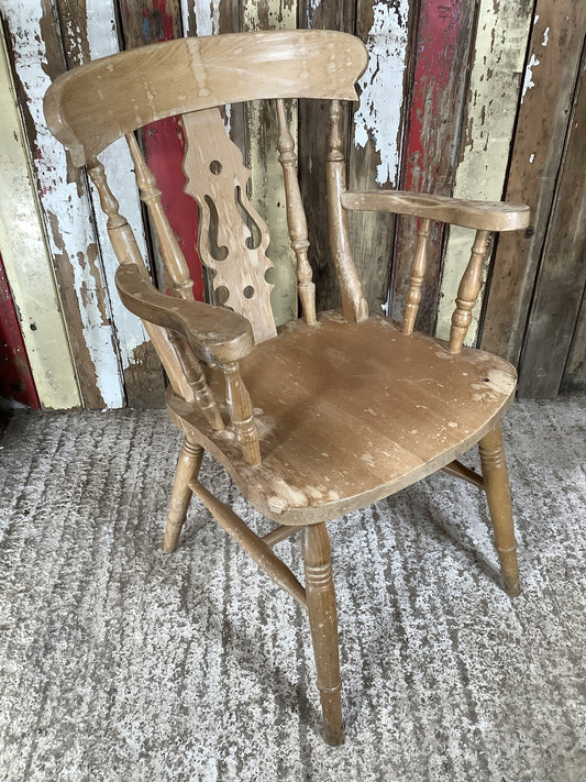 Old Farmhouse Varnished Solid Beech Fiddle Tall Back Carver Kitchen Arm Chair