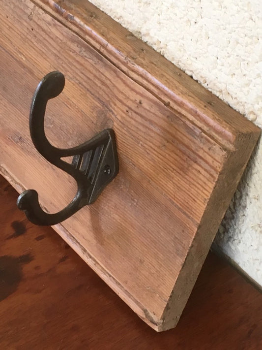 23 1/2" Interesting Old Reclaimed Pine Rack Of 3 Cast Iron Double Coat Hooks