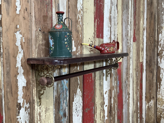 Antique Old Stained Pine & Brass Single Shelf with Wooden Towel Rail 7"H 2'1" W