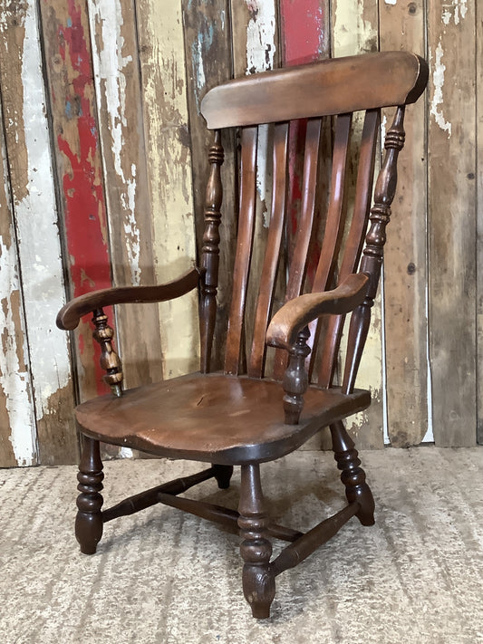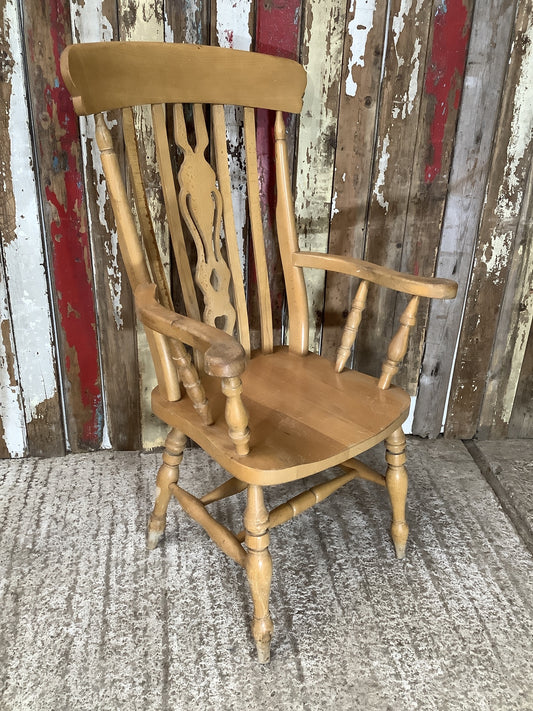 Old Farmhouse Varnished Solid Beech Fiddle Tall Back Carver Kitchen Arm Chair