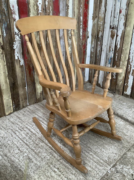 Tall Slat Back Granddad Used Old Varnished Beech Rocking Chair Wooden