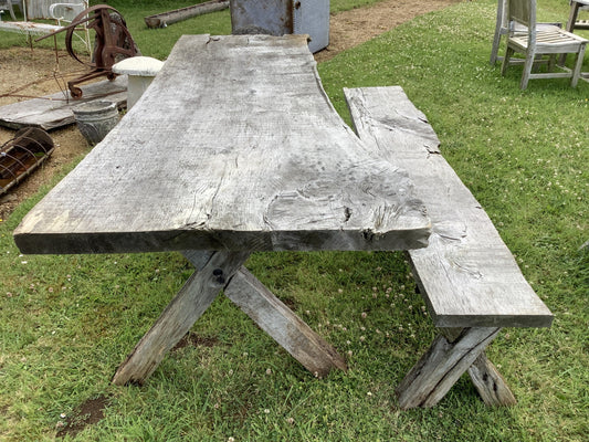 7'4" Long Old Solid Oak Garden Cross legged Table & Backless Bench