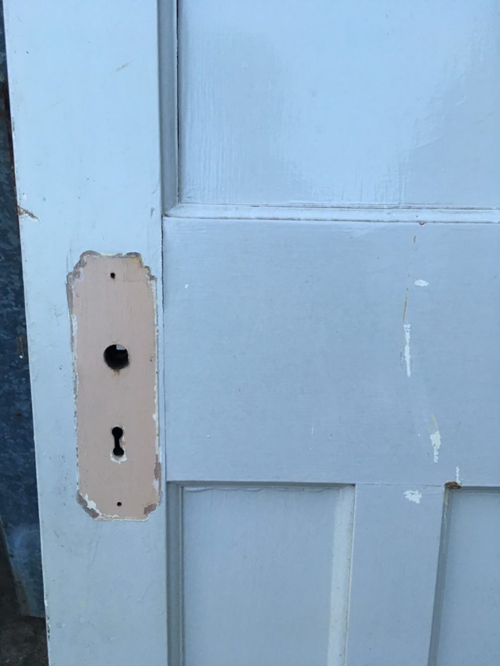 It has some old lock holes, some old nail or screw holes and some flaking paint