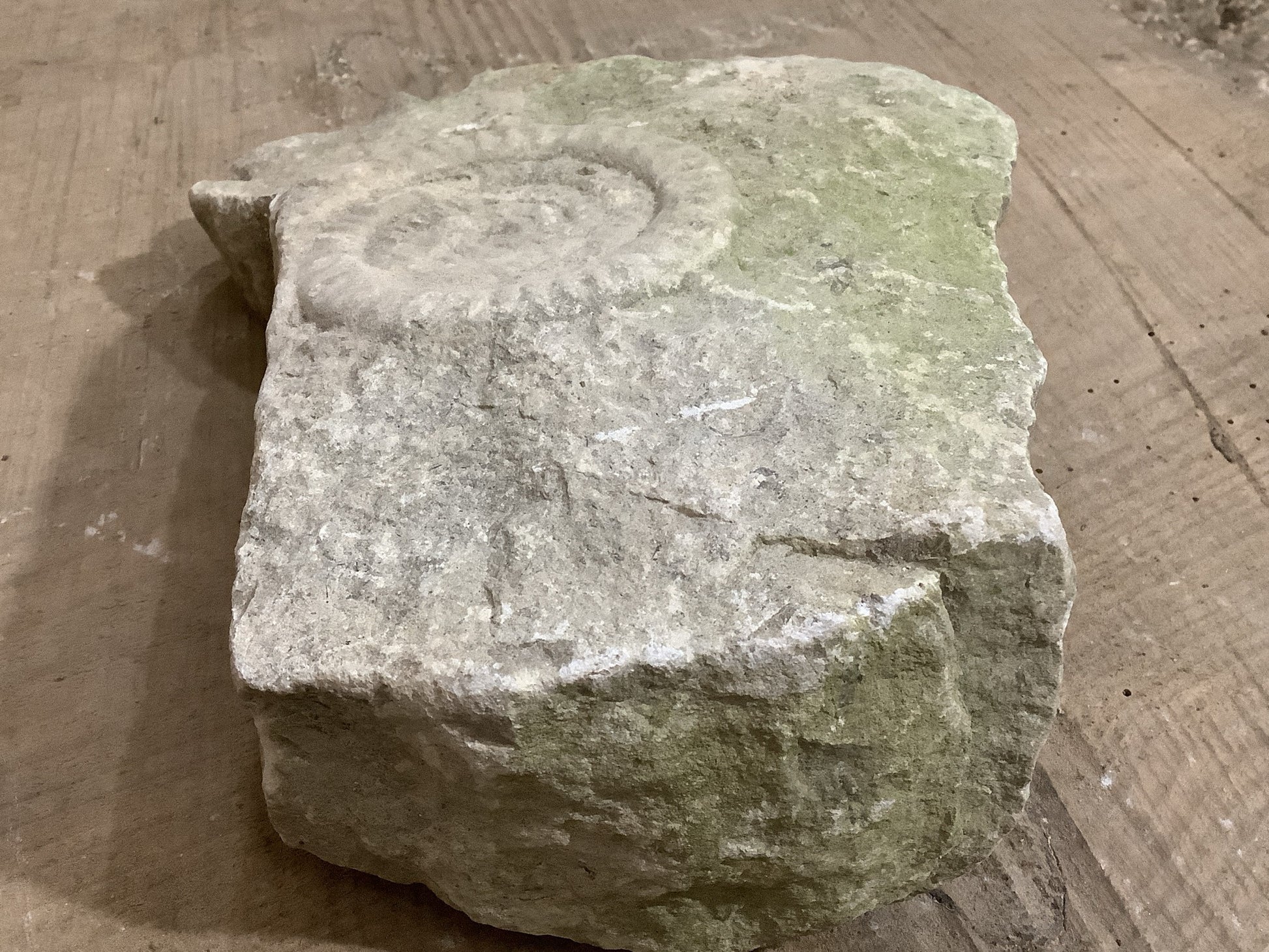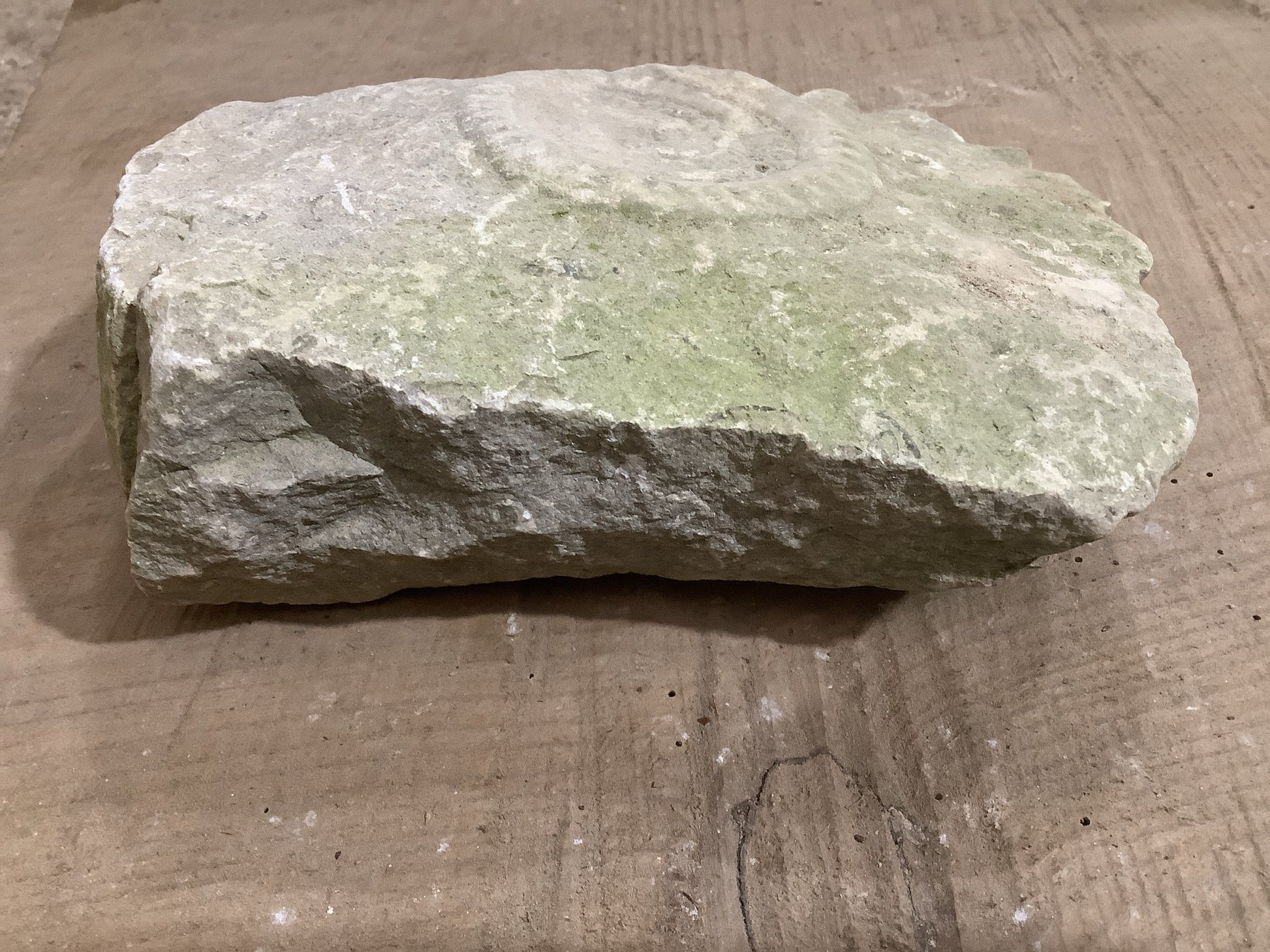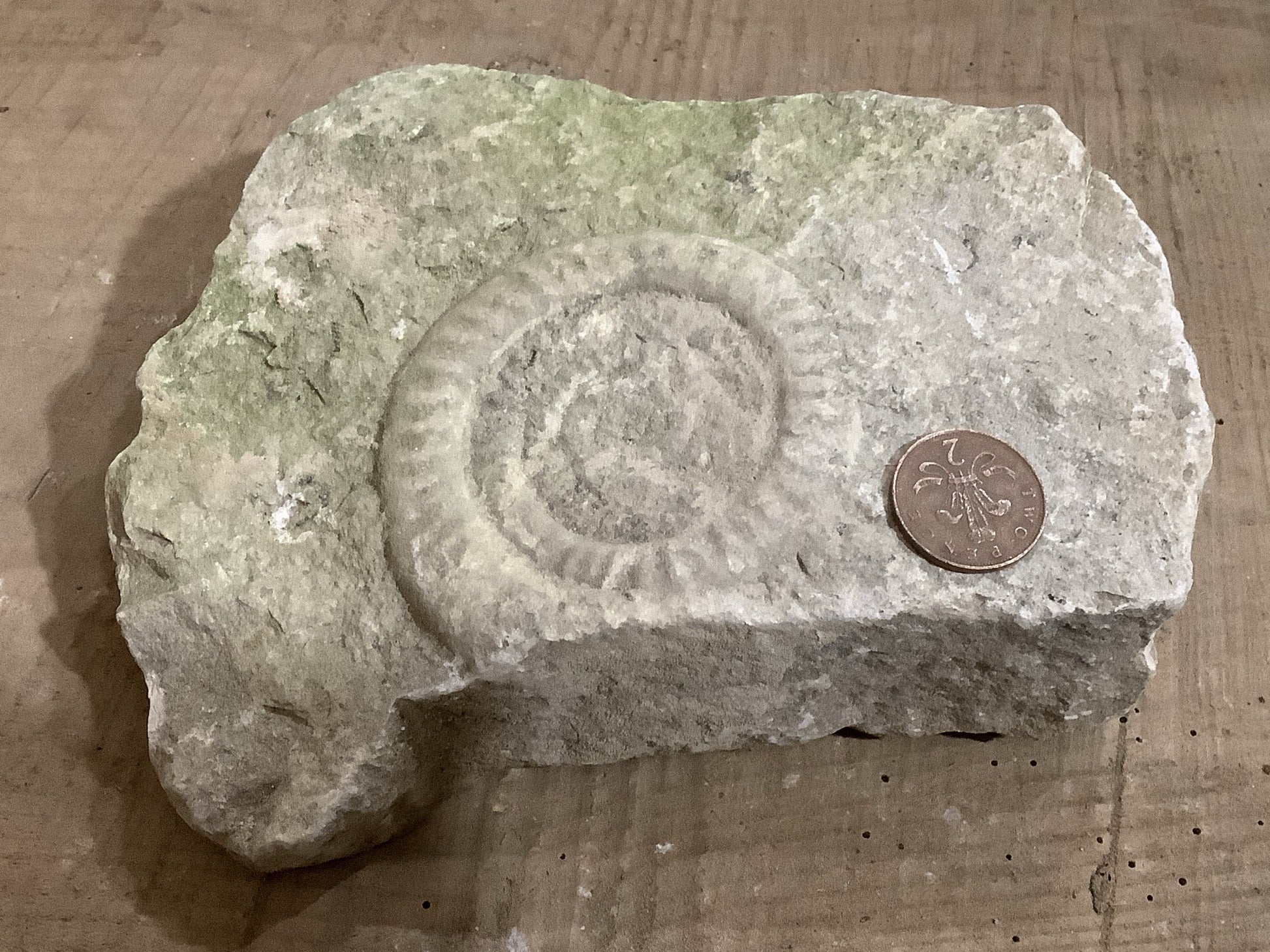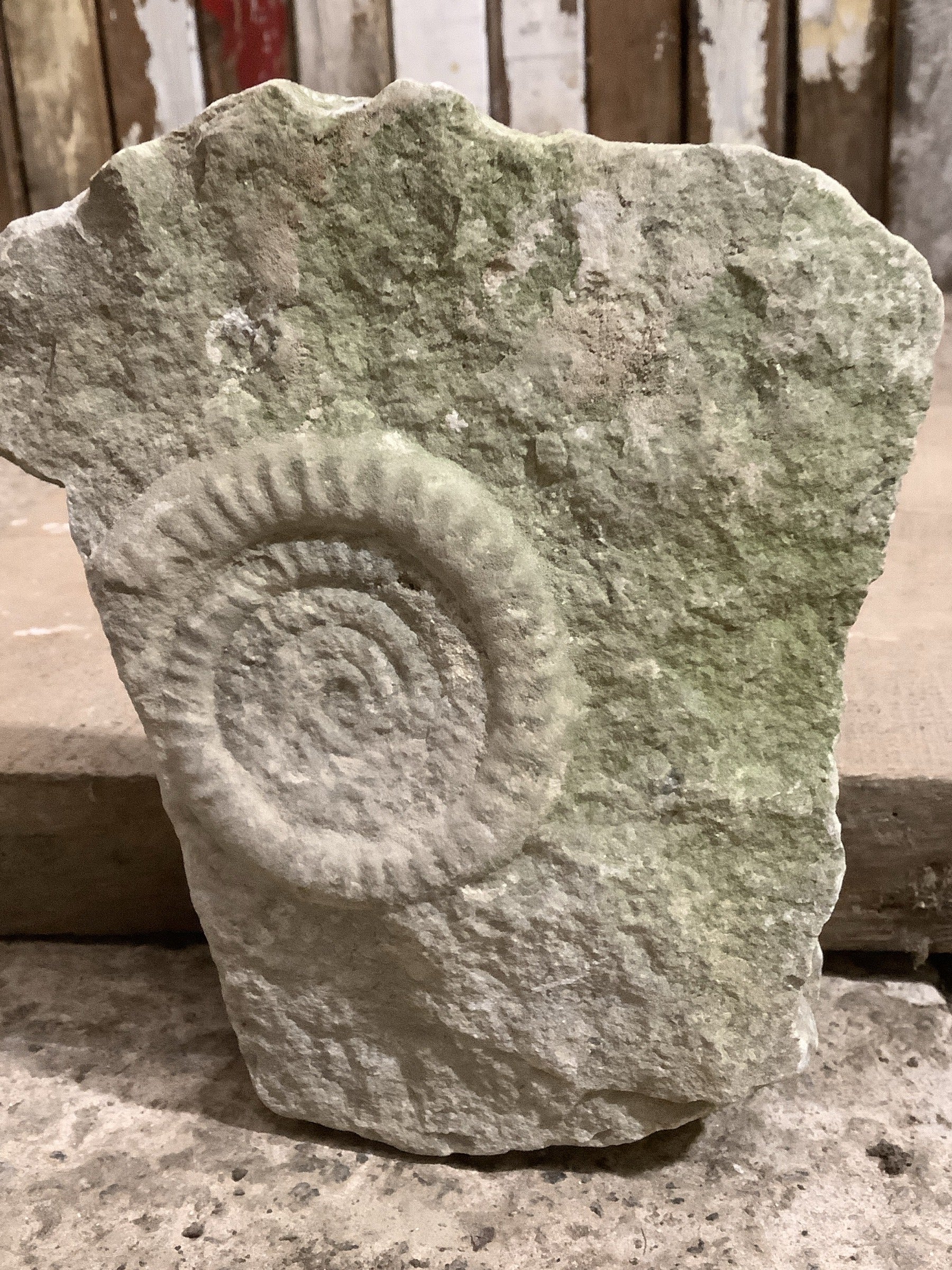 whole size fossil , a little worn but set in the middle but on edge of white lias stone