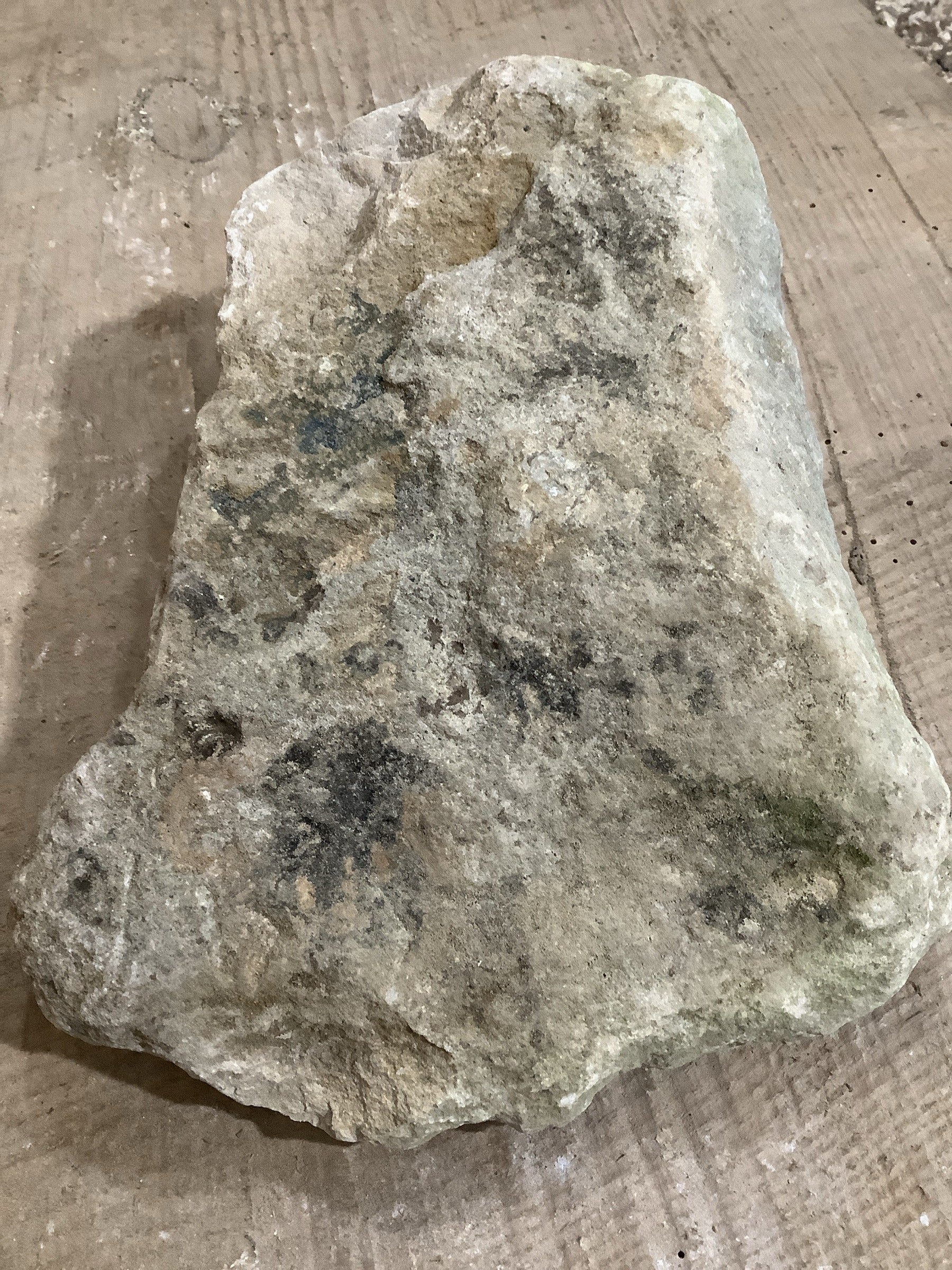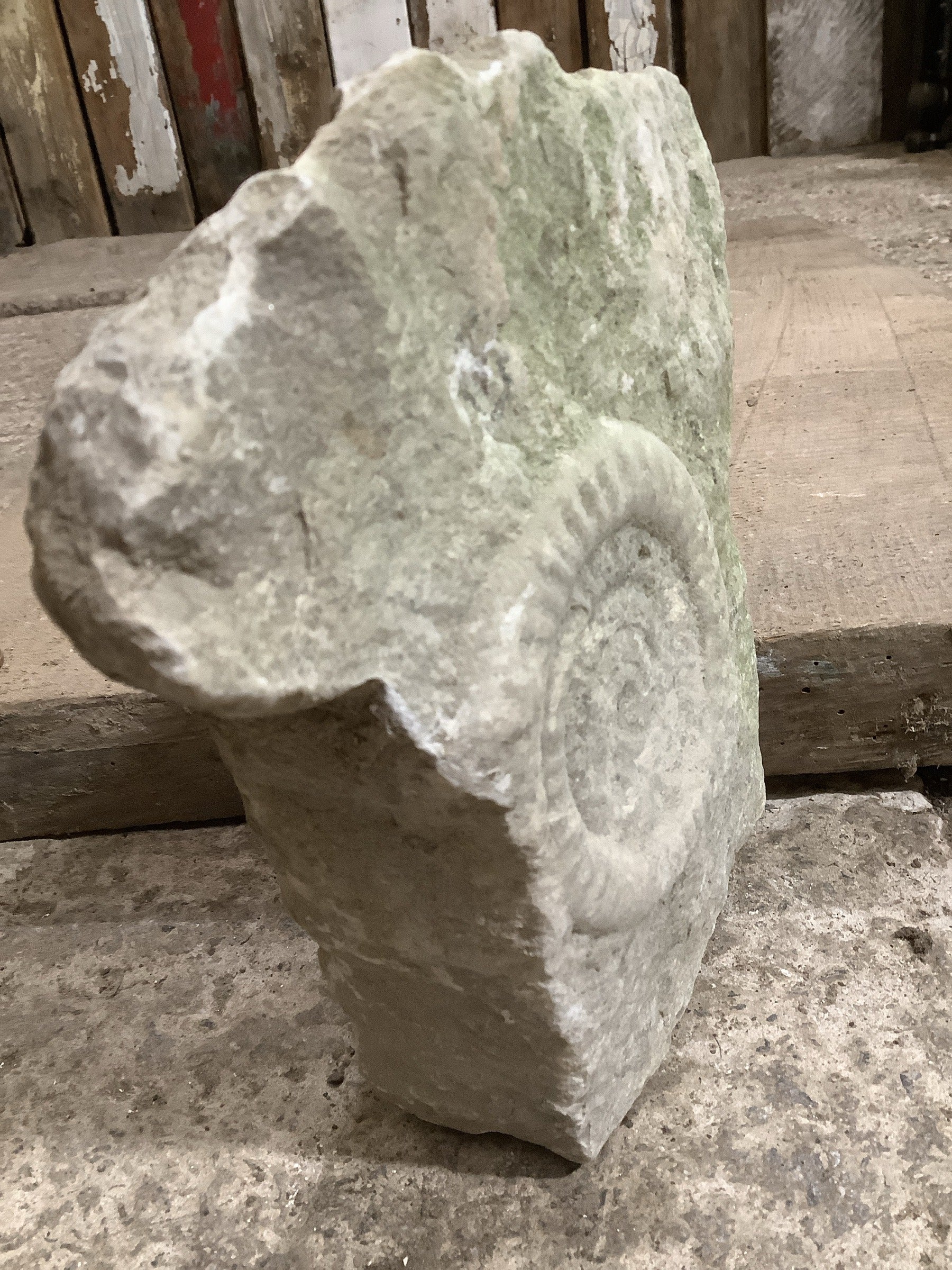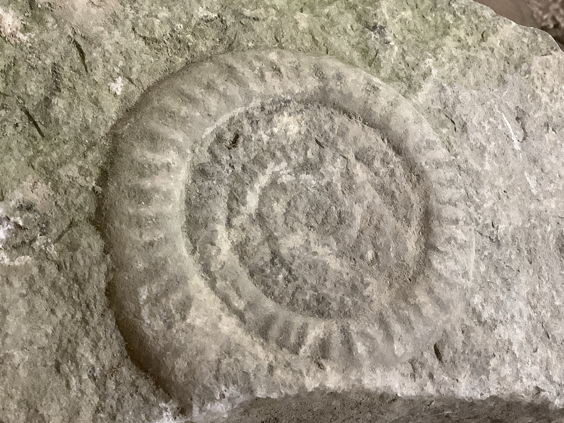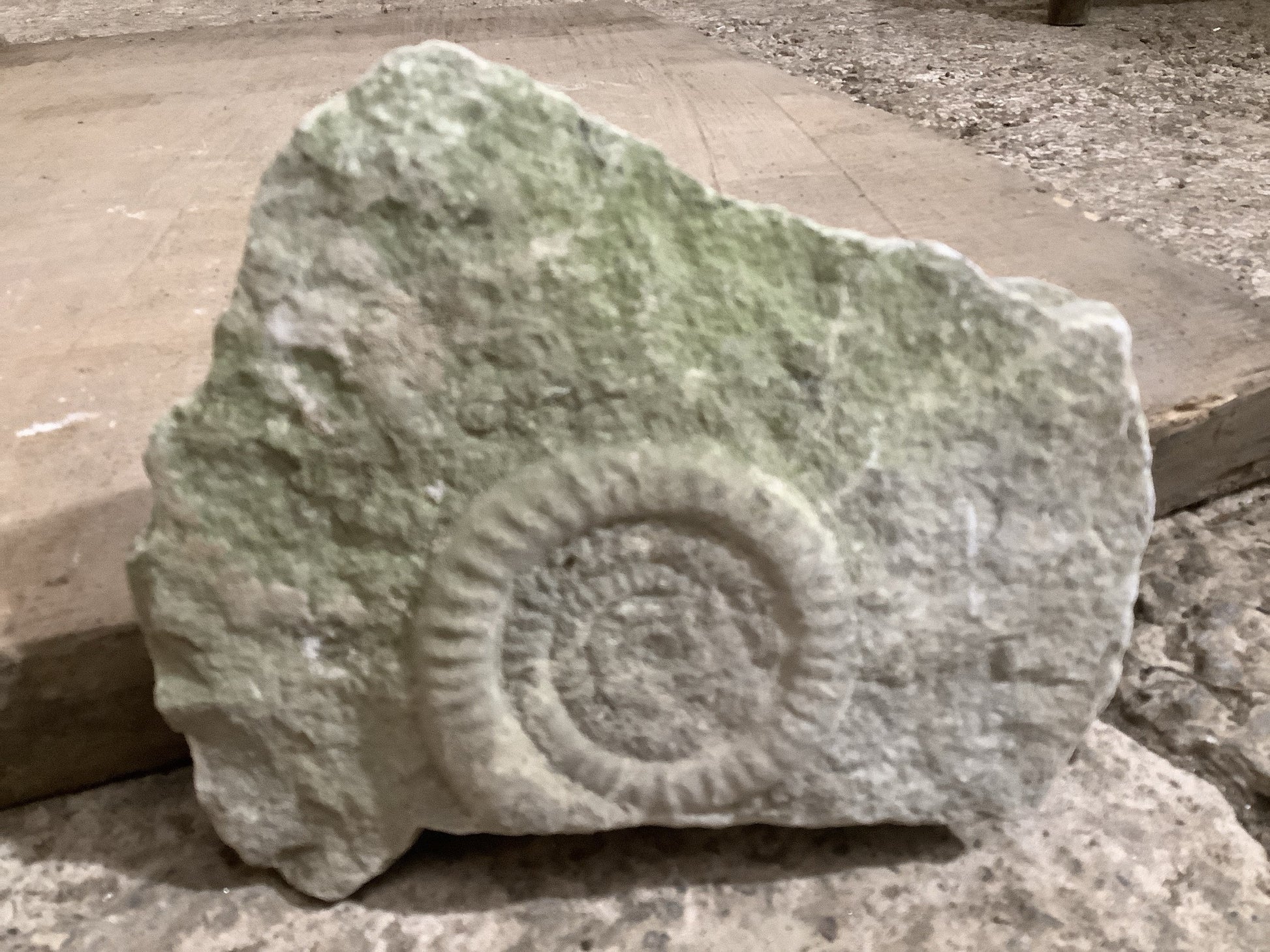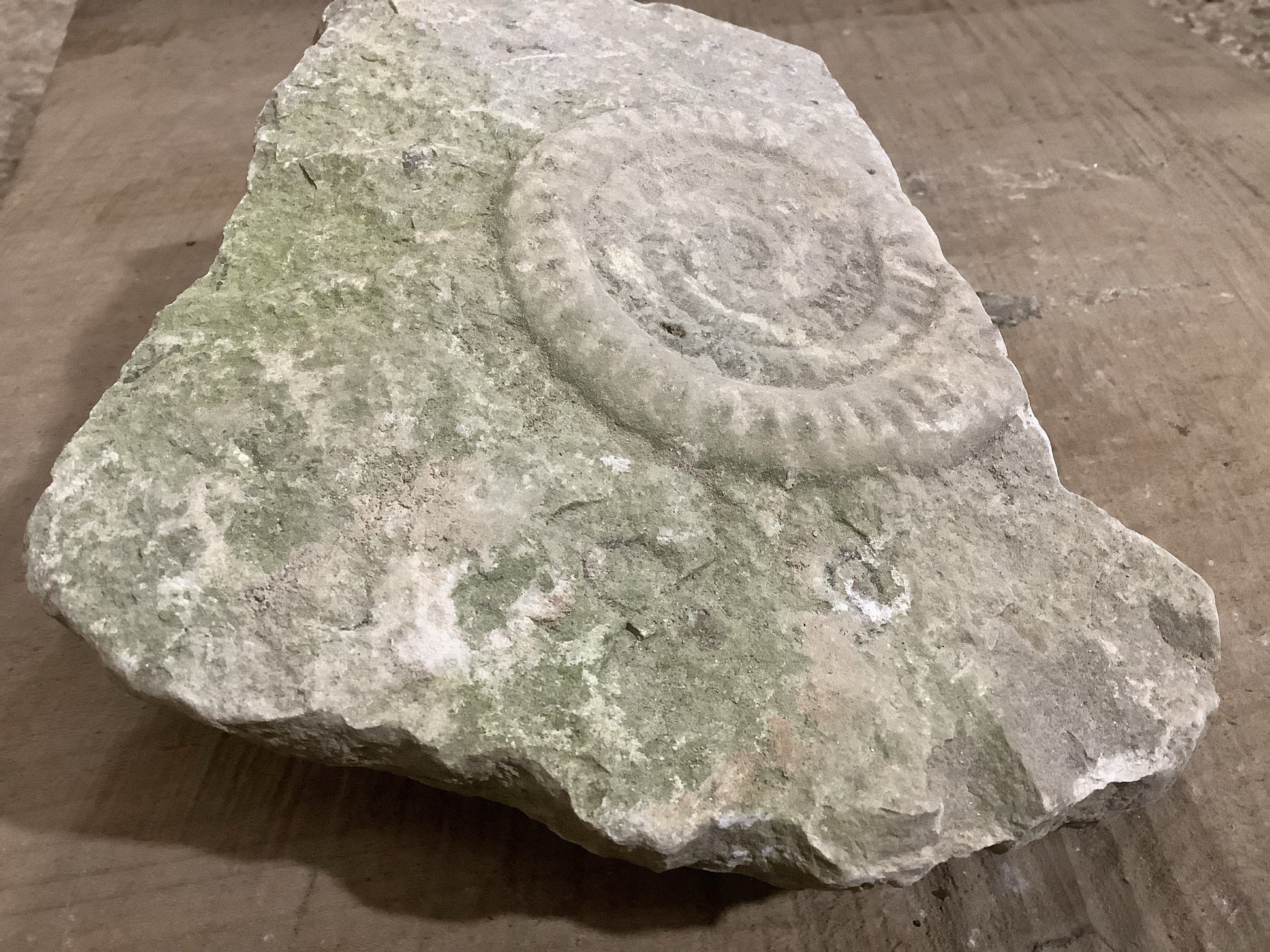 whole size fossil , a little worn but set in the middle but on edge of white lias stone