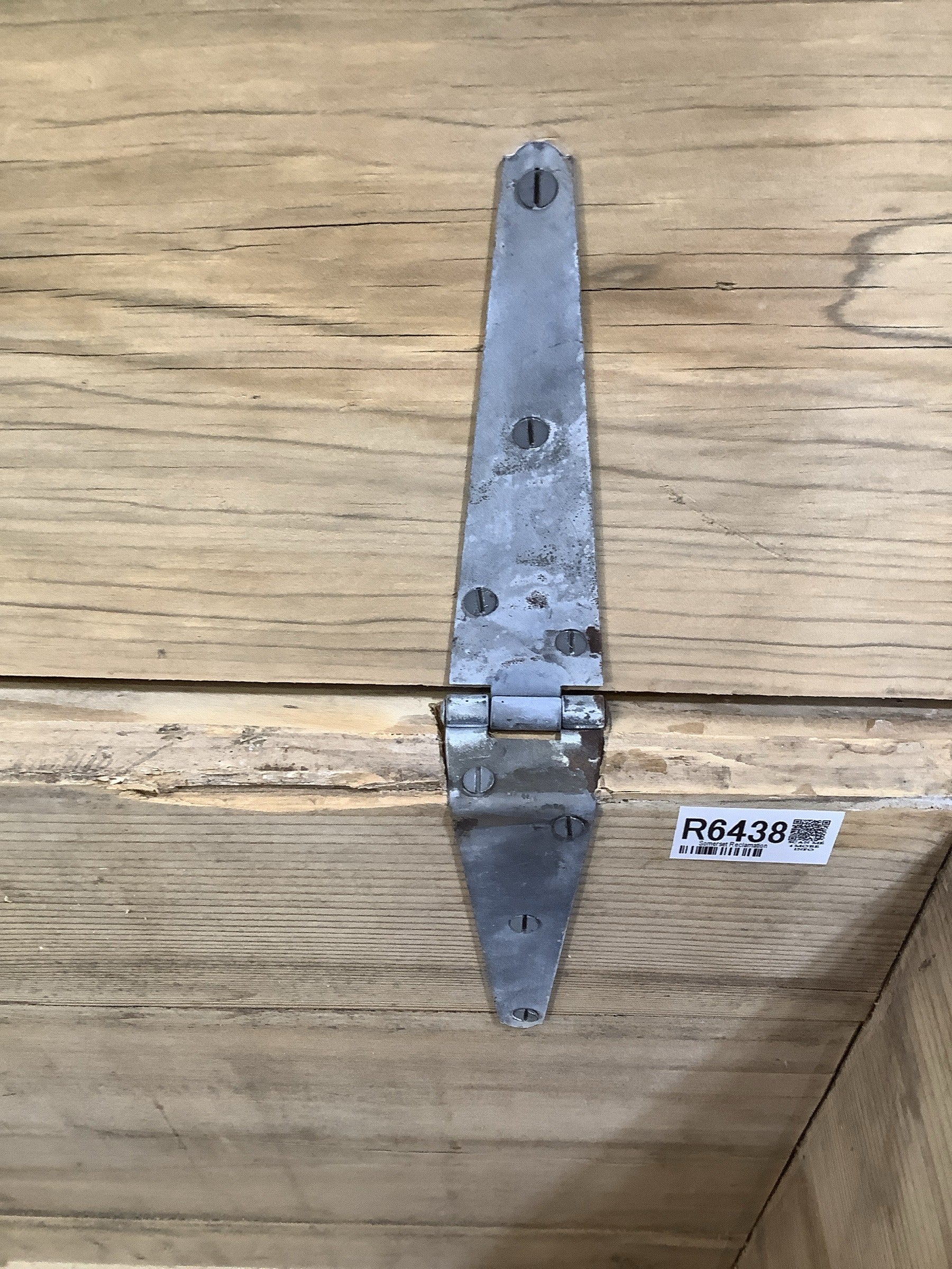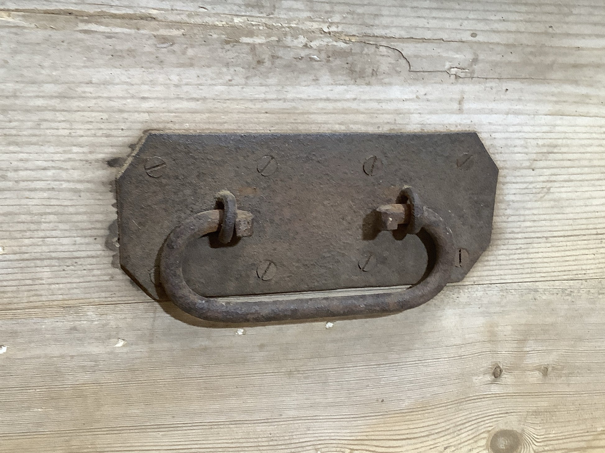 This box had been out in an old shed for many years it has been restored with a new old bottom and lid with a fresh pair of hinges but still the original wrought iron handles either side.